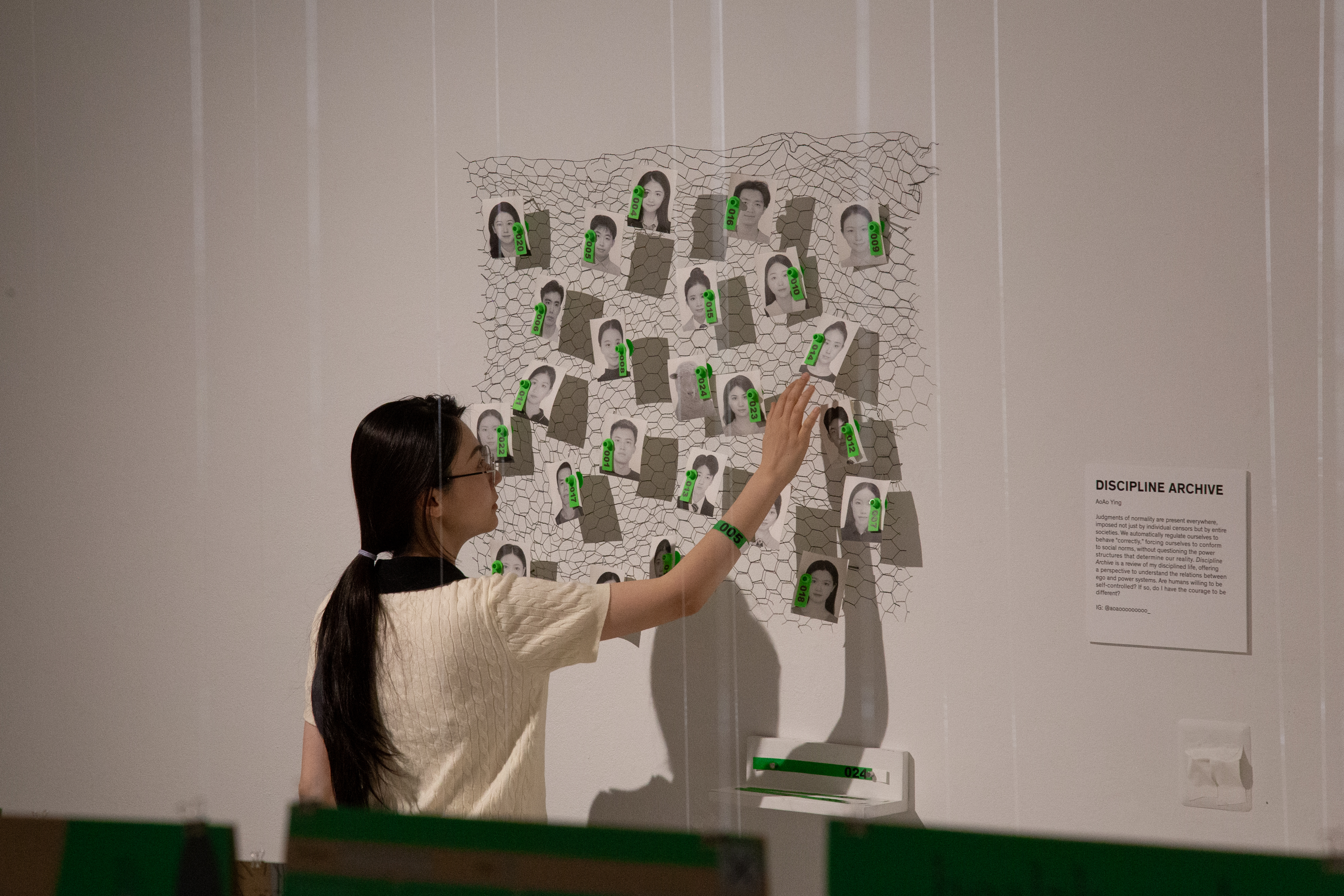 Discipline Archive, my MFA thesis exhibition, showcased my exploration of discipline and conformity. I suspended 24 deconstructed regulation-object posters using fishing line, symbolizing a "24-year path of discipline." Green-colors on the prints represented concepts "normal" and "qualified," intensifying as they reflected my gradual assimilation to social norms. Behind the posters, a video projection, "Parallel Universe," merged photos from my 2022 quarantine and sheep farms in Maryland. The projected light, obstructed by fishing line, created prison-like bars, symbolizing societal constraints. My body is also a jail.